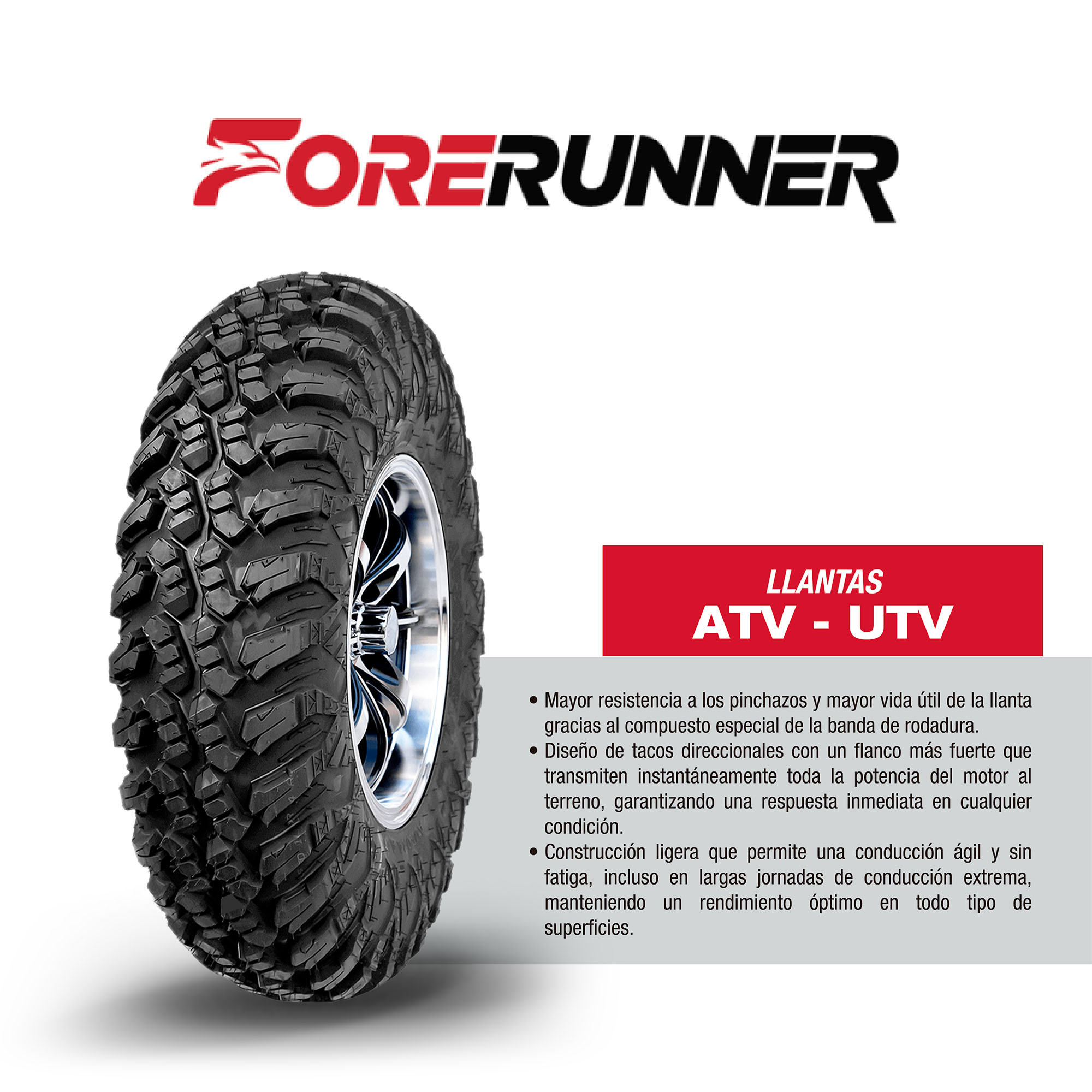 FORE RUNNER Compuesto de caucho especializado para darle a tu cuatrimoto o ATV, una excelente tracción en terrenos desérticos y rocosos. Es una llanta de muy buena durabilidad. Diseñadas para resistir en terrenos difíciles, ofrecen durabilidad y tracción excepcional. Con un diseño robusto y una construcción resistente, aseguran un desempeño confiable en trabajos pesados. LLANTA […]